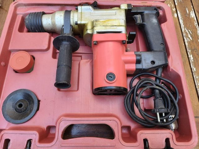 Taladro percutor eléctrico con su maletín original. - Incluye mango auxiliar. - Incluye accesorios. - Color rojo y plateado.