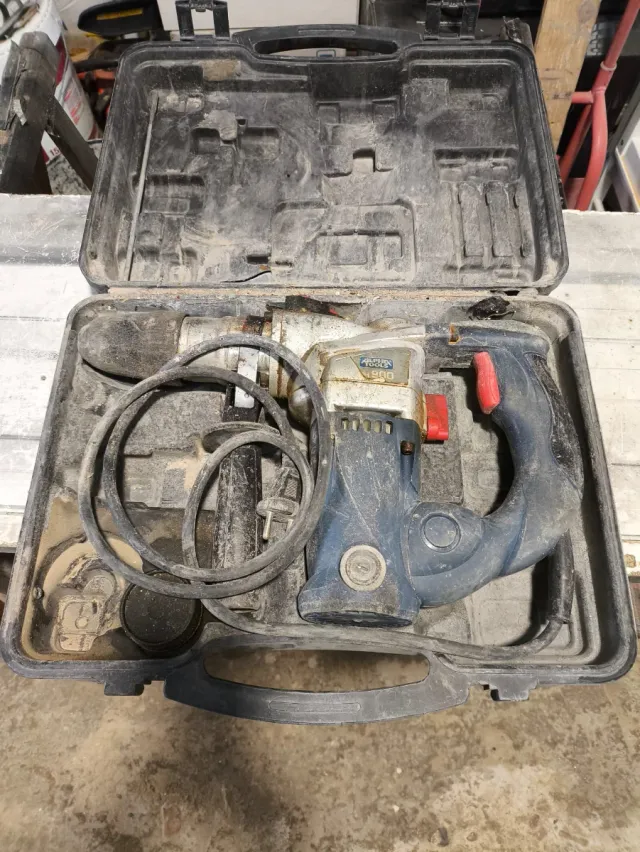 Taladro percutor eléctrico con su maletín de transporte. No funciona. - Incluye taladro y maletín. - Cable de alimentación.