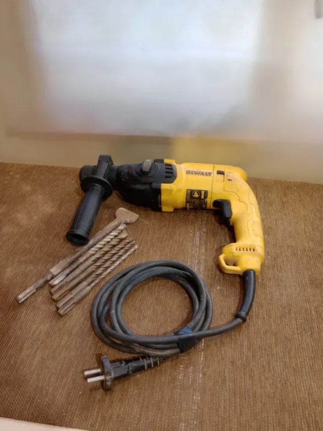 Taladro percutor martillo de la marca Dewalt. Incluye mango auxiliar y varias brocas. - Mango auxiliar. - Juego de brocas para diferentes usadas y pala dé regalo.