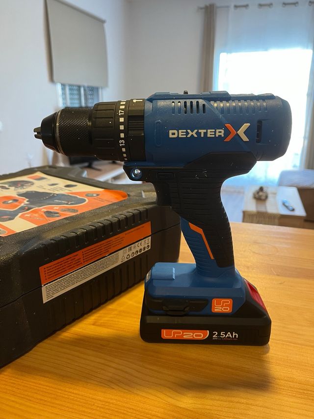 Taladro percutor inalámbrico Dexter con batería de litio. - Modelo: UP20 - Voltaje: 20V - Capacidad de batería: 2.5Ah - Incluye maletín de transporte.
