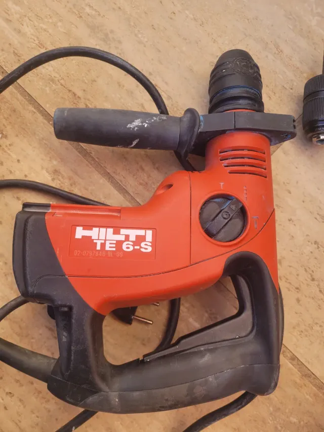 Taladro percutor Hilti de color naranja. - Mango auxiliar. - Selector de modo. - Portabrocas.