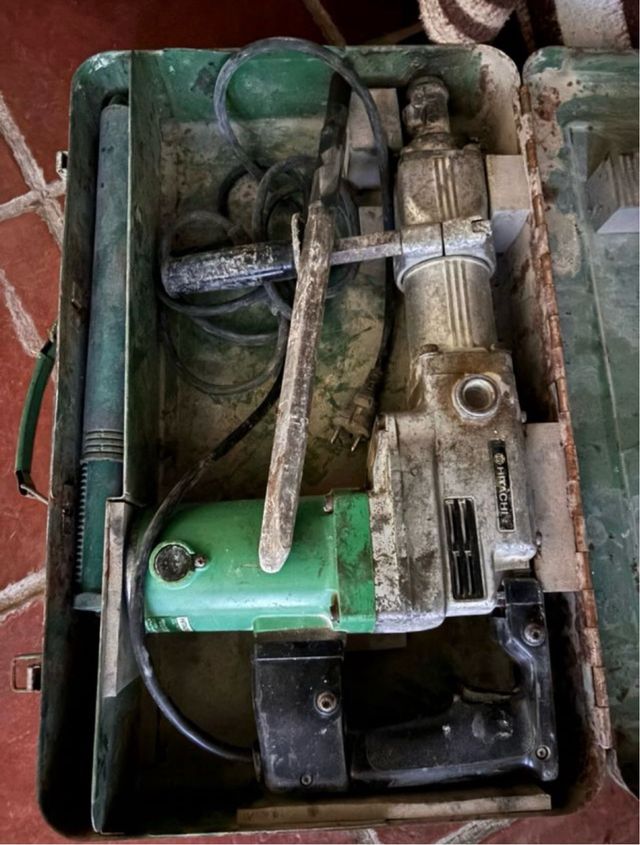 Taladro percutor Hitachi H55SA en su maletín original. - Incluye cincel. - Maletín de transporte verde. Pica pica Hitachi en buen estado con sus 3 asesorios