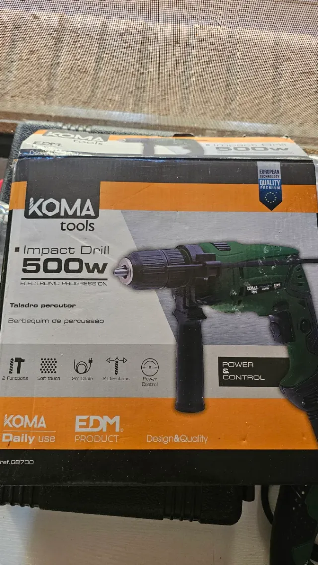 Detalles del productoTaladro percutor eléctrico KOMA Tools de 500W en su caja original. Perfecto para tareas de bricolaje en casa, colgar cuadros, estanterías, etc.
