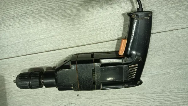 Taladro percutor de color negro. - Mango ergonómico. - Gatillo de velocidad variable. - Portabrocas. - Rejillas de ventilación.