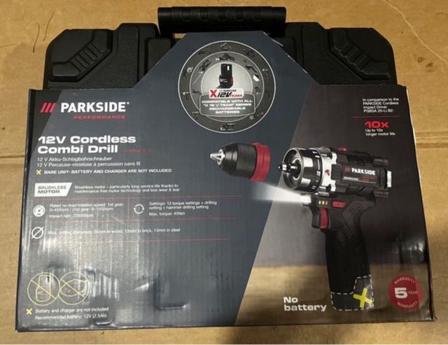 Detalles del productoTaladro percutor inalámbrico Parkside de 12V con motor Brushless. Se vende la unidad sin batería ni cargador.