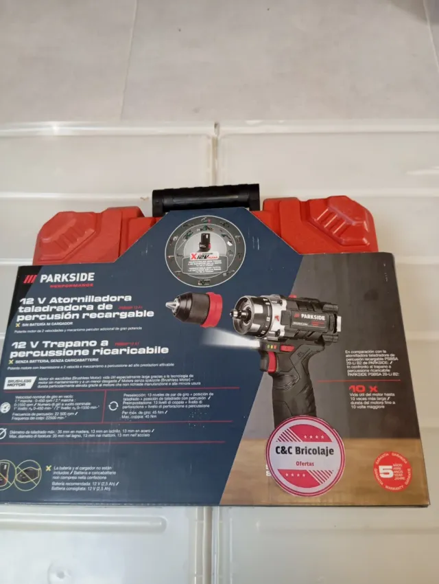 Detalles del productoTaladro atornillador percutor recargable Parkside de 12V.