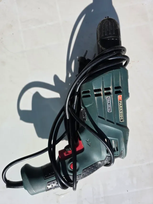 Taladro percutor de la marca Parkside, modelo PSKM 500 B3. Es una herramienta eléctrica con cable. - Color verde y negro. - Empuñadura ergonómica.