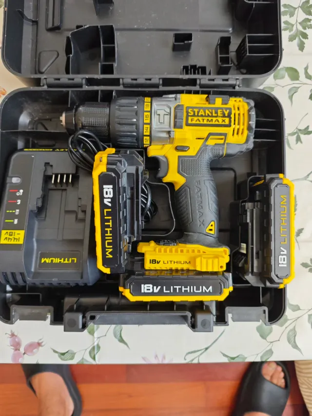 Taladro percutor Stanley Fatmax con baterías de litio. - Incluye taladro, cargador y 3 baterías de 2AH 18V. - Baterías de litio. - Maletín para transporte.