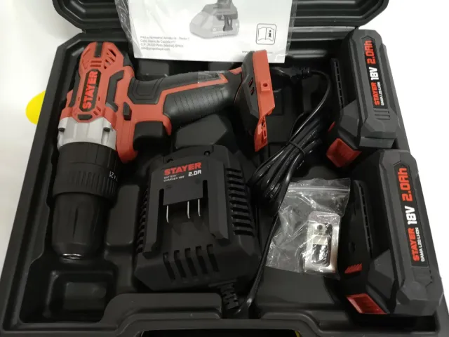 Taladro percutor Stayer con batería de litio. 1 año de garantía. - Incluye dos baterías de 18V y 2.0Ah. - Cargador rápido Stayer. - Maletín de transporte.