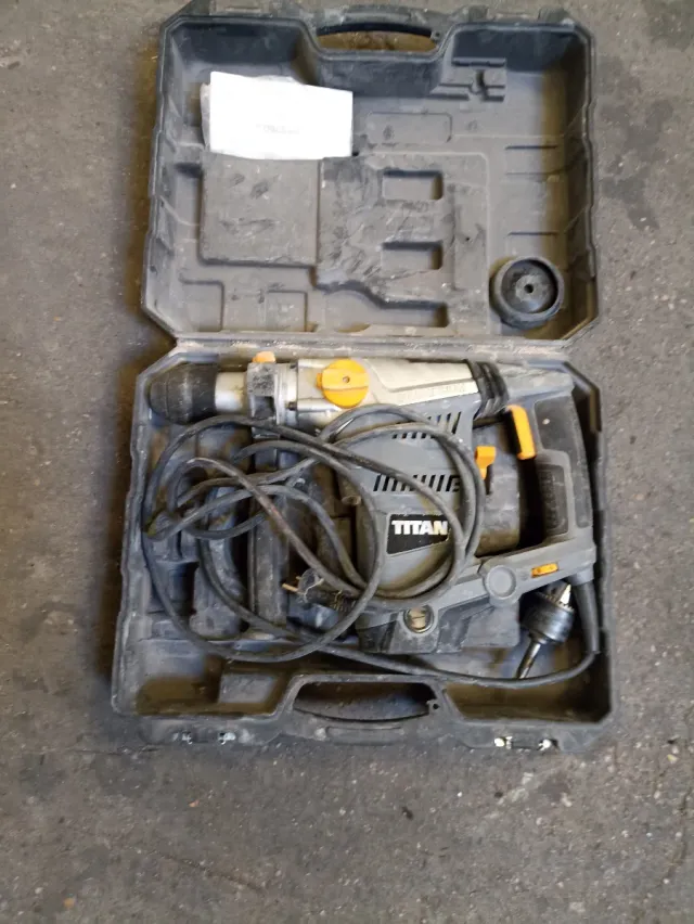 Se vende taladro percutor de la marca Titan, con su maletín. - Incluye cable de alimentación. - Maletín de transporte. - Mango auxiliar.