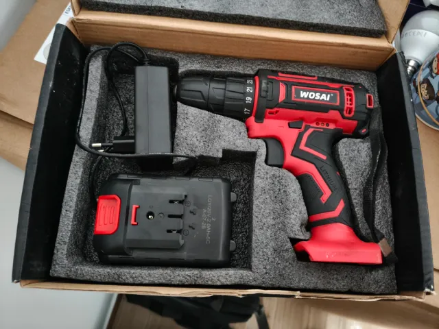 Detalles del productoTaladro eléctrico Wosai de color rojo y negro, con tecnología LITHIUM.