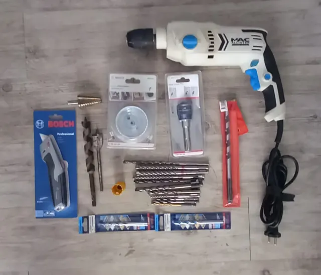 Se vende taladro con varios accesorios. - Taladro eléctrico. - Brocas de diferentes tamaños y tipos. - Sierra de corona. - Cúter Bosch Professional.