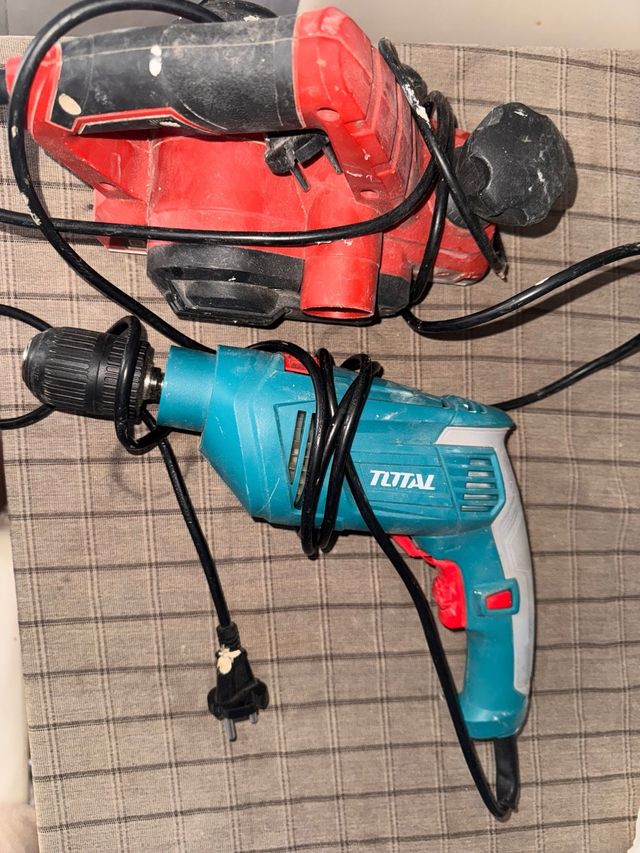 Se venden herramientas eléctricas, un taladro y una lijadora. - Taladro de color azul y gris con cable. - Lijadora de color rojo y negro con cable.