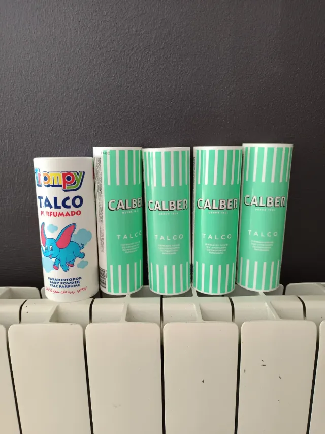 Lote de talco para bebés y adultos. - Un bote de talco perfumado Trompy. - Cuatro botes de talco Calber. Todos sin abrir.