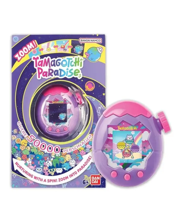 Tamagotchi Paradise de Bandai. ¡Un mundo de diversión y personajes. - Más de 50,000 personajes. - Diseño en forma de huevo. - Colores morado y rosa.