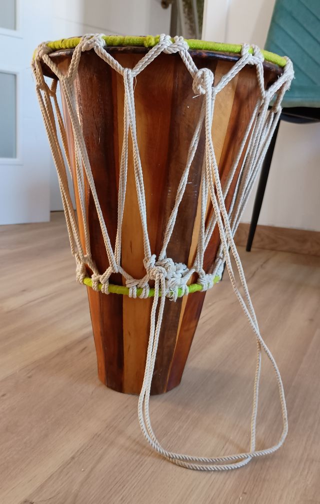 Detalles del producto44x33 Tambor africano de madera con cuerdas. Solo se ha usado de decoración. Nada de desgaste. Hay que apretarlo
