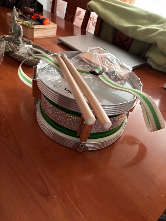 Tambor infantil con los colores de la bandera de Andalucía. Incluye baquetas y correa. - Diseño con purpurina. - Correa con rayas verdes y blancas.