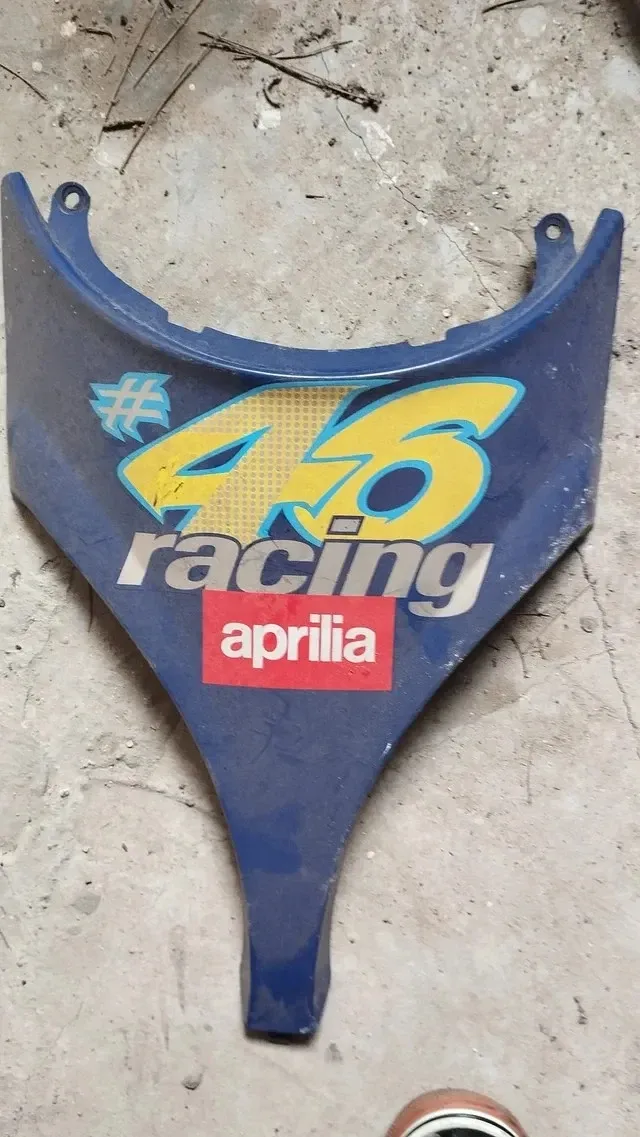 Pieza de plástico azul con diseño de Aprilia Racing. - Número 46 en amarillo. - Inscripción racing en plateado. - Logo de Aprilia en rojo.