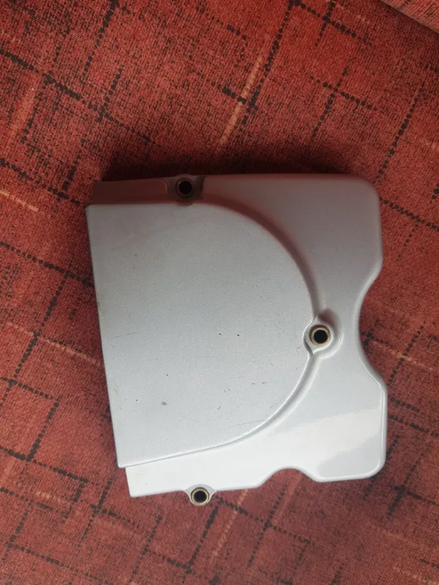 Tapa de piñón de arrastre para Hyosung Aquila 125. - Color plateado. - Diseño curvo. - Tres puntos de anclaje.