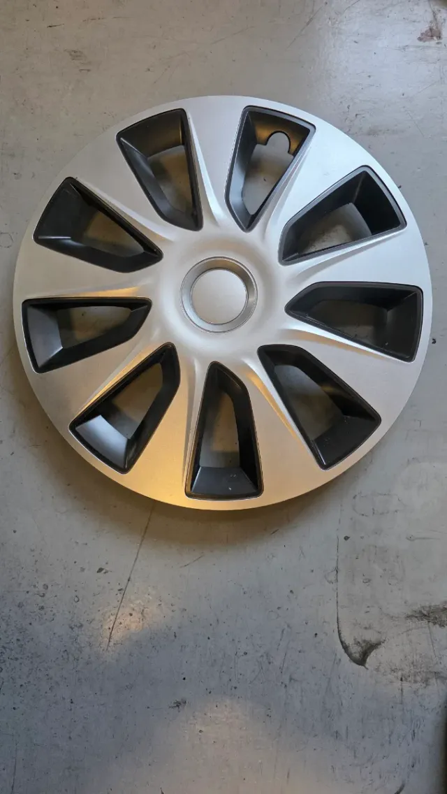 Juego de tapacubos plateados con detalles en negro. - Tamaño: 16 pulgadas. - Diseño de 10 radios.