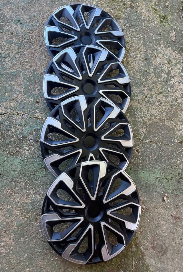 Detalles del productoSet de cuatro tapacubos de 16 pulgadas con un diseño moderno en negro y detalles plateados.