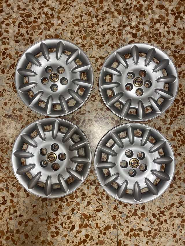 Set de cuatro tapacubos para Chrysler de 16 pulgadas. - Diseño plateado con detalles dorados en el centro. - Fabricados en plástico resistente.