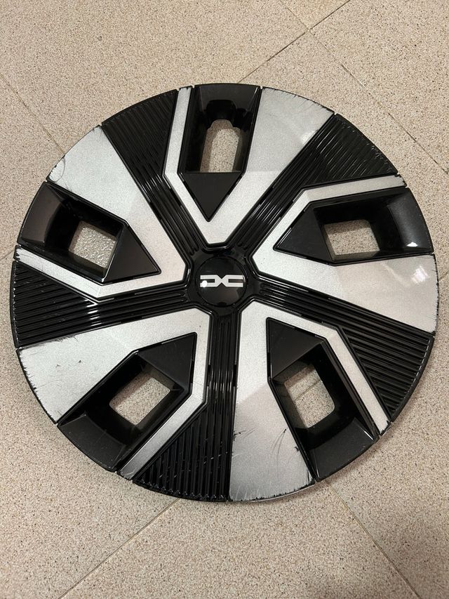 Tapacubos de diseño moderno para Dacia. - Color negro y plateado. - Logo de Dacia en el centro. - Diseño con múltiples radios.