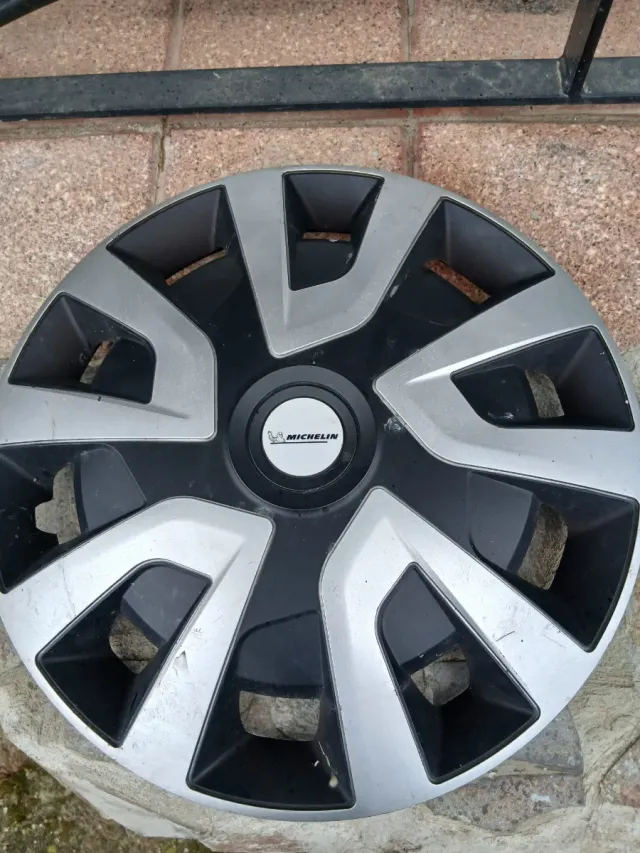 Tapacubos de la marca Michelin con un diseño moderno y deportivo. - Tamaño: 15 pulgadas. - Color: Gris y negro.