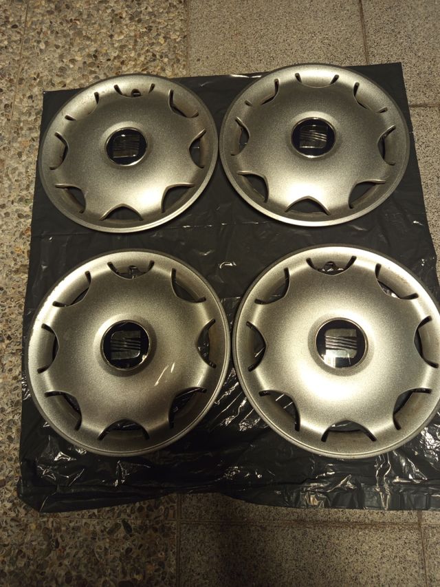 Set de cuatro tapacubos para Seat.(Están muy bien conservados,apenas rayados) - Diseño plateado. - Logo de Seat en el centro. - Fabricados en plástico resistente.
