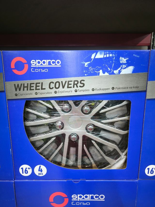 Se venden packs de tapacubos marca Sparco Corsa en 16 pulgadas muy buena calidad y un diseño muy bonito. Nuevos a estrenar
