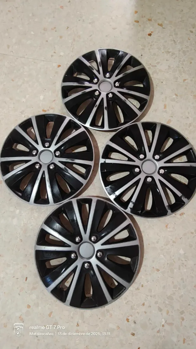 Detalles del productoJuego de cuatro tapacubos universales de 16 pulgadas. Diseño moderno en color negro y plateado.