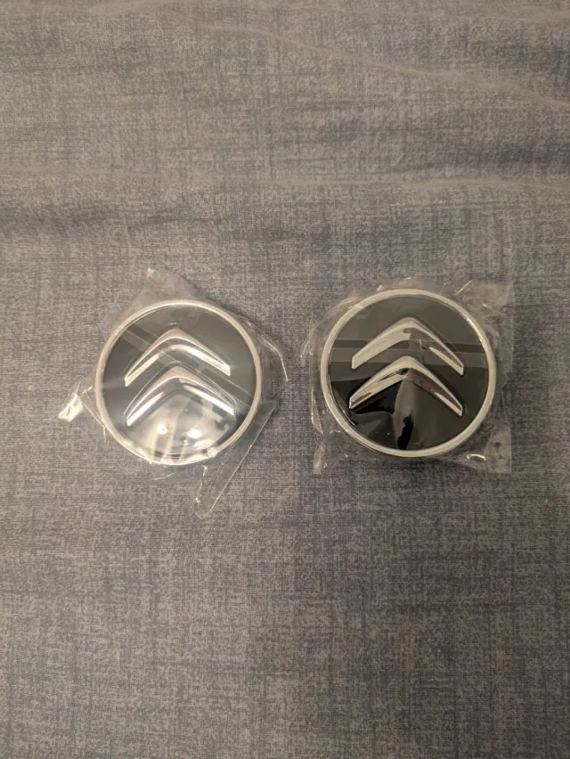 Detalles del productoJuego de dos tapas para bujes de llanta de Citroën. Son redondas y presentan el icónico logo de la marca en plateado sobre fondo negro.