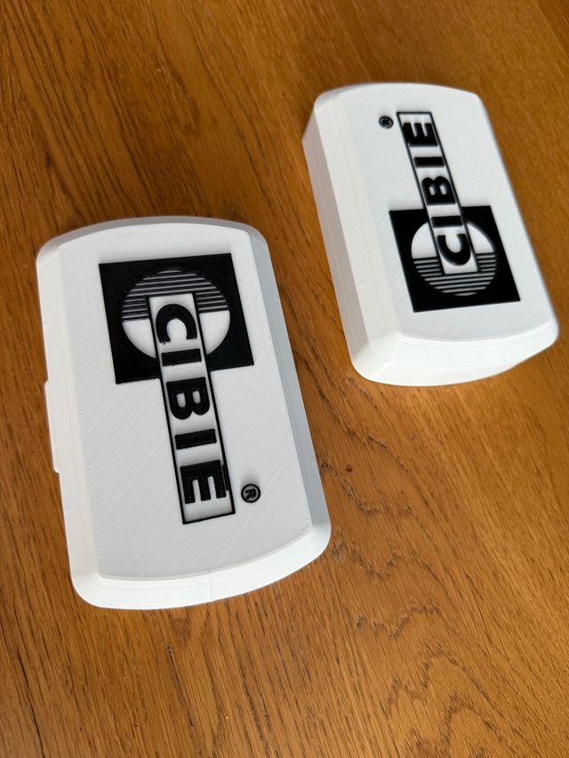 Dos tapas blancas con el logo de Cibie en negro. Para J