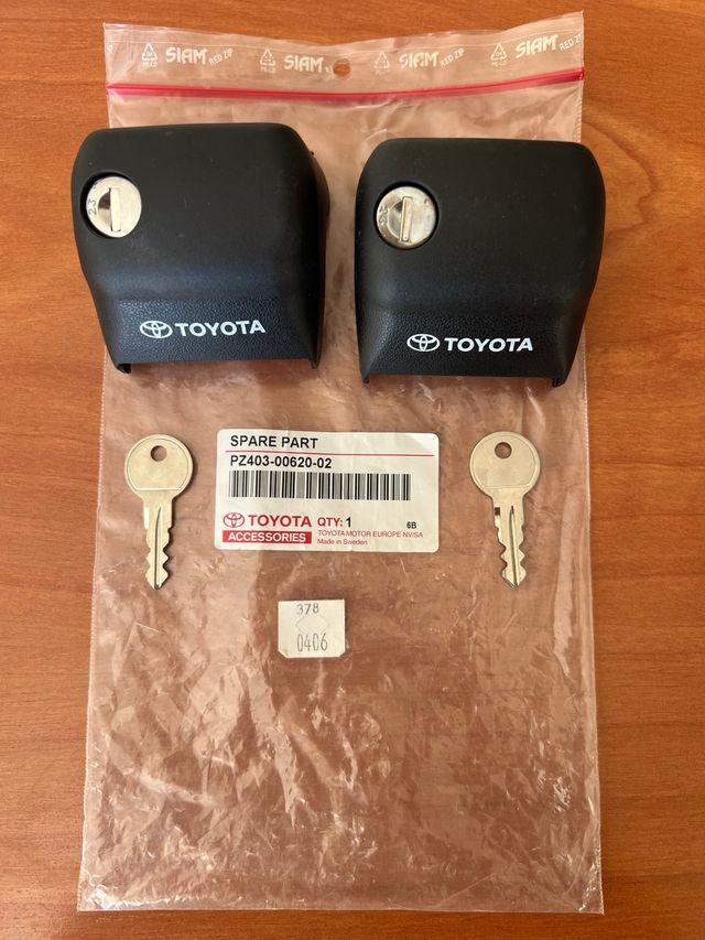 Juego de tapas de cierre para barras porta objetos Toyota, referencia Incluye dos llaves. - Tapas negras con logo Toyota. - Incluye 2 llaves.