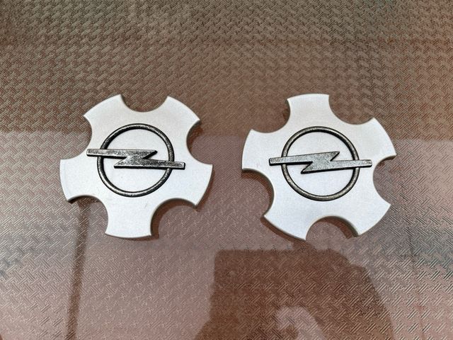 Juego de tapas para las llantas de un Opel Astra. Diseño plateado con el logo de Opel. - Logo de Opel. - Color plateado.
