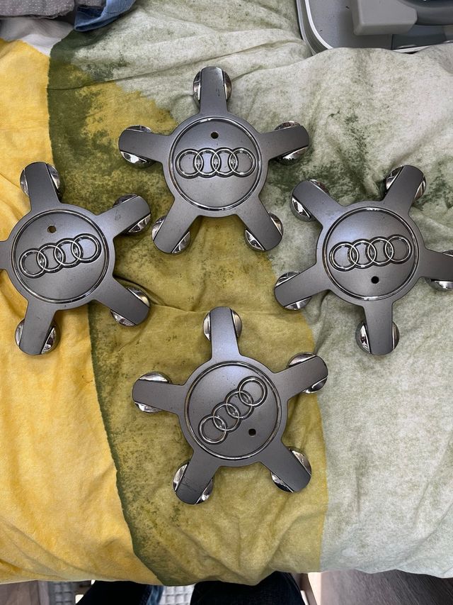 Juego de 4 tapas para llantas de Audi. Diseño plateado con el logo de los cuatro aros. - Logo Audi central. - Diseño de 5 radios. - Acabado metálico.