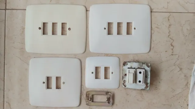 2 marcos triple. 3 marcos doble. 1 base unico. 2 base doble. 4 Interruptores. 1 enchufe. 1 fusible Color blanco y blanco roto.
