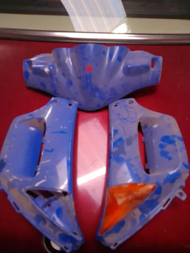 Conjunto de tapas de plástico para Peugeot Speedfight en color azul. Presentan un diseño con salpicaduras de pintura. - Tapa frontal. - Tapas laterales.