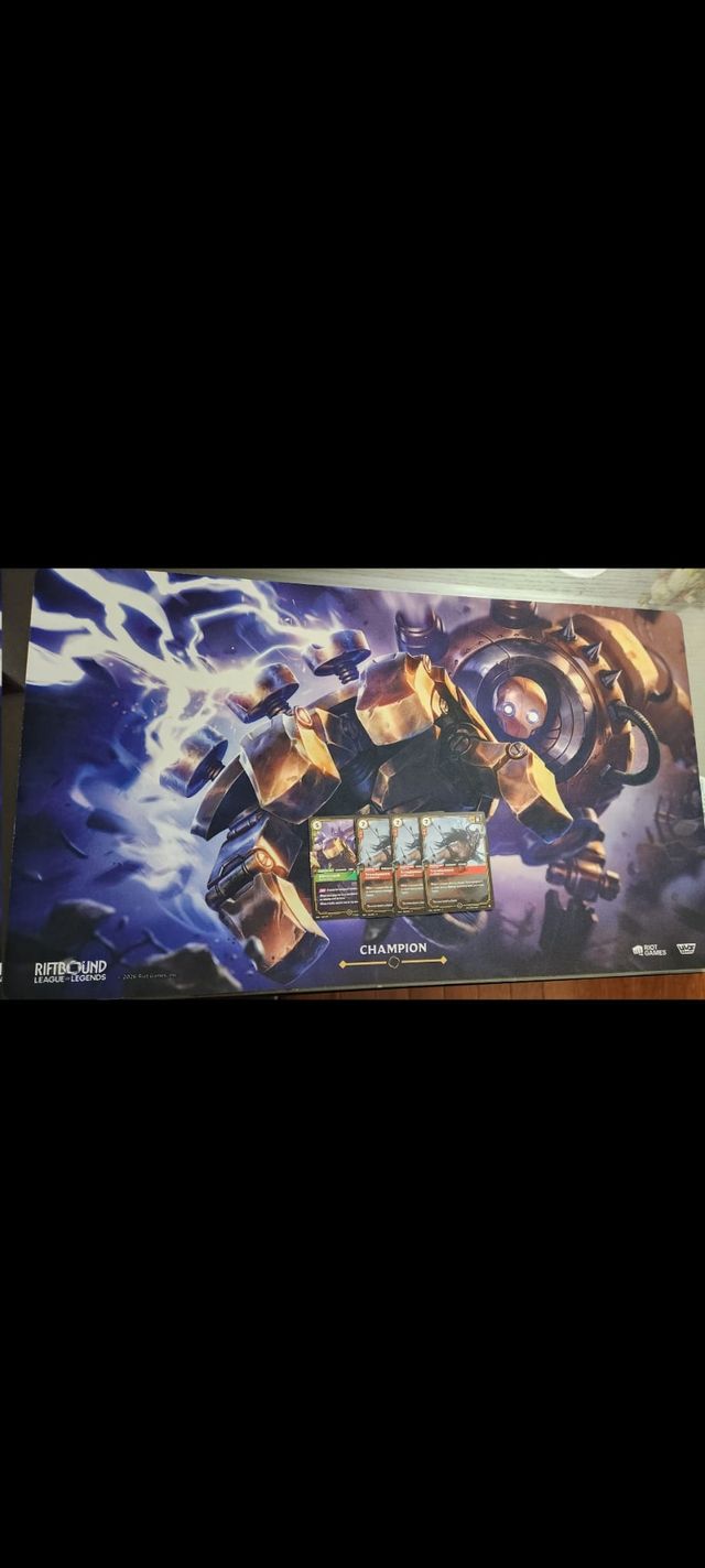 PRECIO NEGOCIABLE Tapete Blitzcrank, Impassive Champion - Incluye cuatro cartas de juego. - Logotipo Riftbound League en la esquina inferior izquierda.