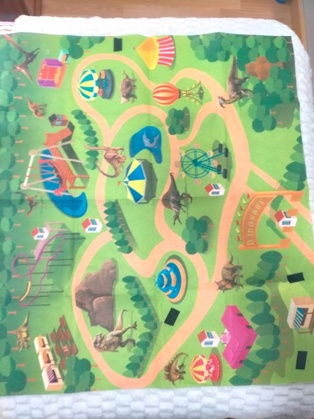 Detalles del productoTapete de juego infantil con temática de dinosaurios y un parque de atracciones.