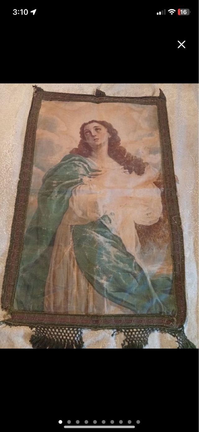 Tapiz antiguo con imagen religiosa. - Borde decorativo. - Flecos en la parte inferior.