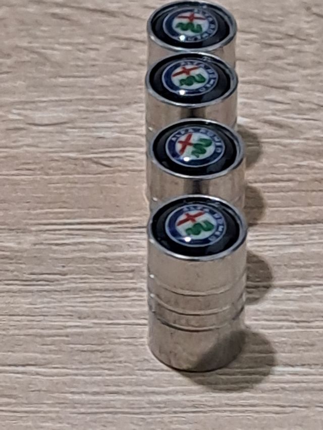 Set de cuatro tapones para válvulas de coche con el logo de Alfa Romeo. - Diseño plateado. - Logo de Alfa Romeo en la parte superior.