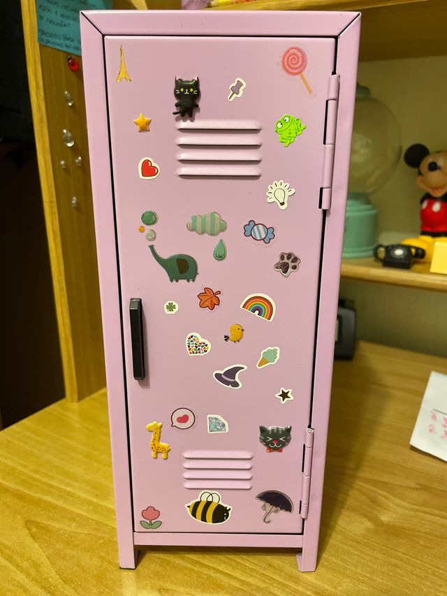 Pequeña taquilla decorada con pegatinas, ideal para guardar joyas o pequeños objetos.