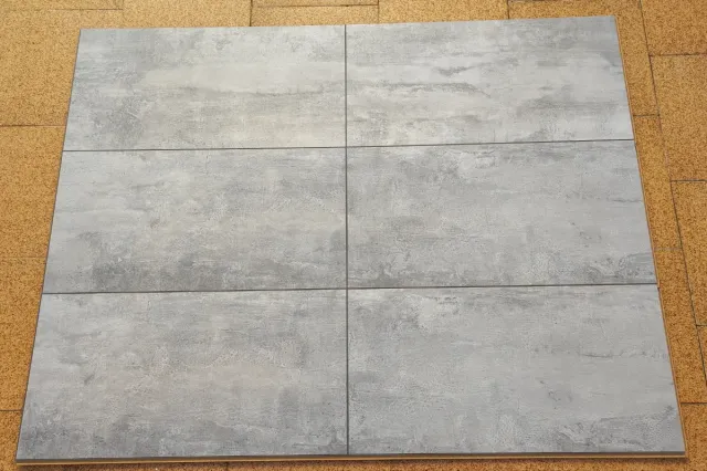 Detalles del producto 8'5 metros cuadrados de tarima flotante con acabado gris piedra, imitando la textura de la piedra natural.