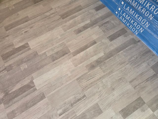 Tarima de madera en tono gris de la marca Lamikron. - Acabado en gris. - Marca: Lamikron. Aproximadamente 25m