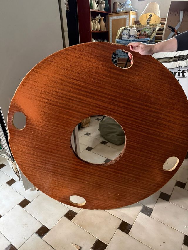 Detalles del productoBase redonda de madera para estufa. Tiene un diseño circular con un gran orificio central y varios orificios más pequeños alrededor.