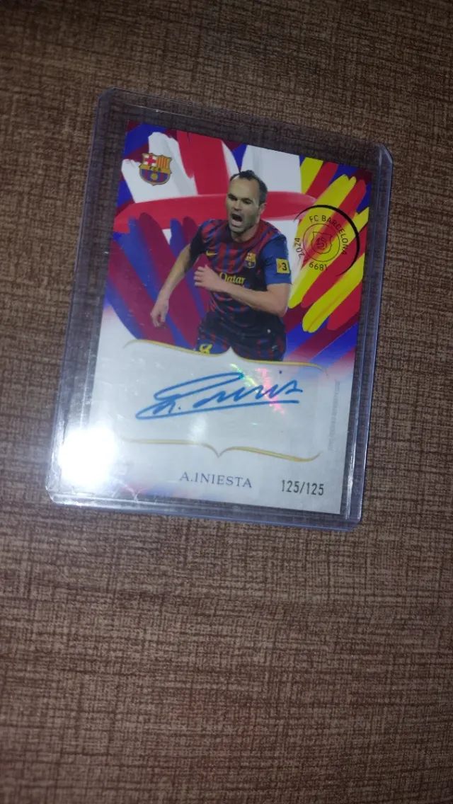 Tarjeta de colección de fútbol firmada por A. Iniesta. Pago bizum o transferencia bancaria - Edición limitada 125/125. - Diseño con los colores del FC Barcelona.