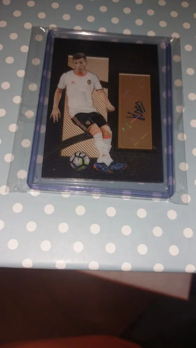 Tarjeta de colección de fútbol con autógrafo Gayá. Pago bizum o transferencia bancaria - Diseño con jugador en acción. - Firma del deportista. - Detalles dorados.