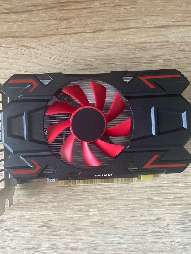 Tarjeta gráfica AMD HD7670 con ventilador. - Diseño en negro y rojo. - Ventilador central de aspas rojas.