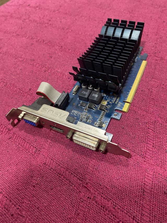 Tarjeta gráfica ASUS con disipador negro. - Conexiones: VGA, HDMI, DVI. - Interfaz PCI Express.